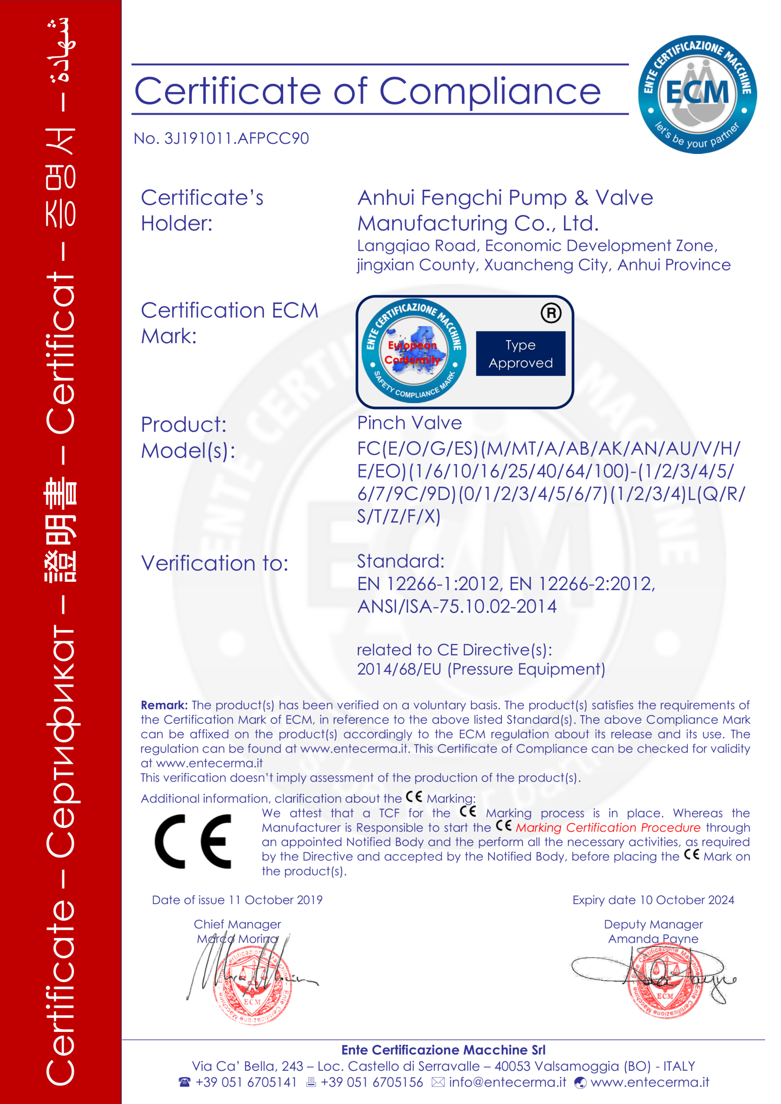 Anhui Fengchi Pompa Vanası Manufacturing Co., Ltd. Sırasıyla ISO9001-2015 kalite yönetim sistemi sertifikasyonu, ISO14000 çevre yönetim sistemi sertifikasyonu, ISO45001 iş sağlığı ve güvenliği yönetim sistemi sertifikasyonu, AB CE sertifikasyonu ve Rohs sertifikasyonunu geçmiştir.